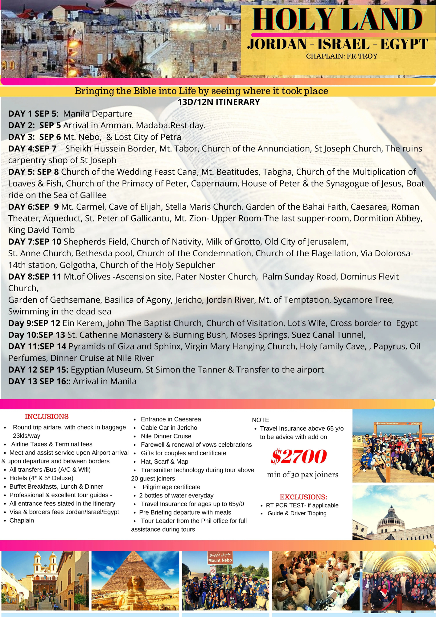 | SEP 5-16, 2022 | FR BENITO DE CASTRO | $2850 ALL IN |